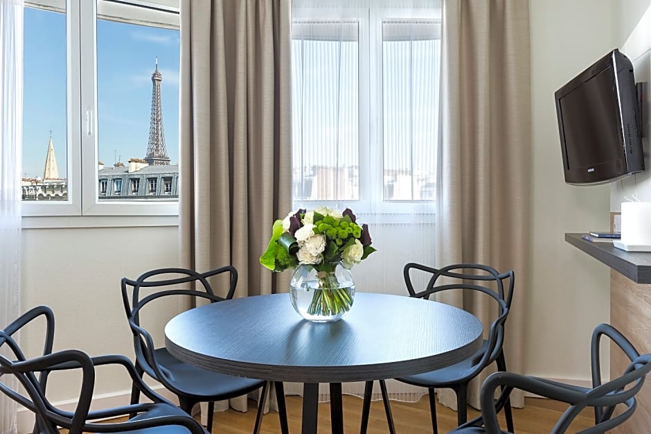 Staying here blends apartment-style living with hotel perks, offering options for a balcony or terrace with garden or landmark views. Some units even boast Eiffel Tower views, letting Paris’s skyline become part of the morning coffee ritual. Inside, free WiFi, air conditioning, and a fully equipped kitchen keep days comfortable and flexible for meals between explorations.